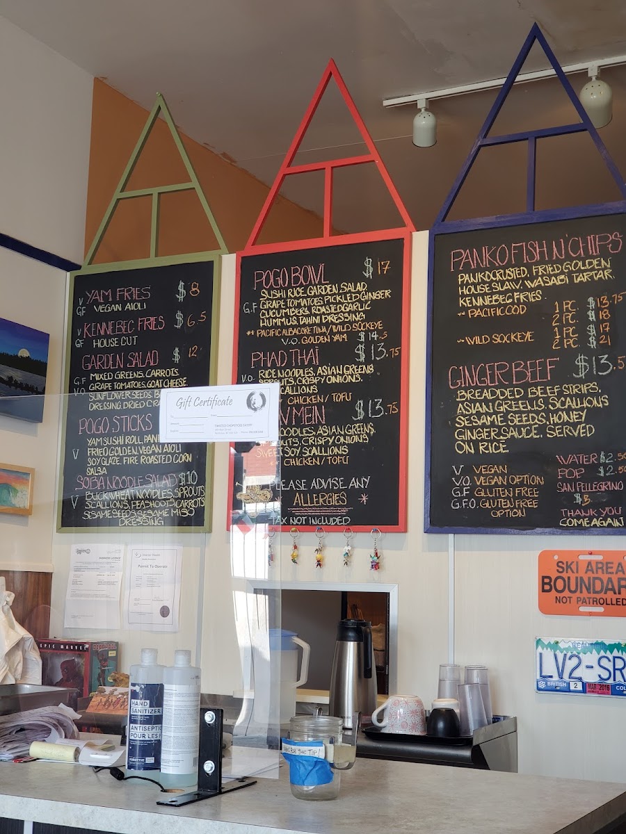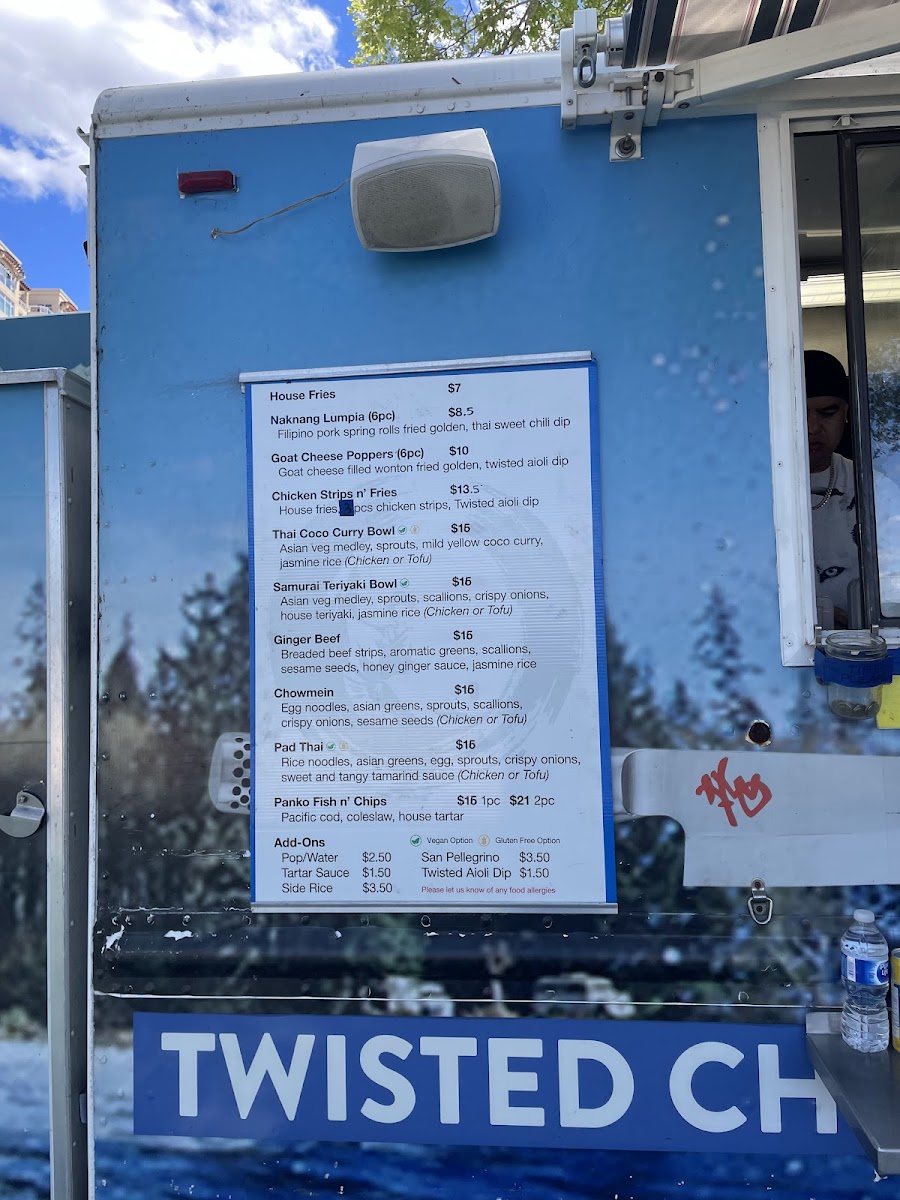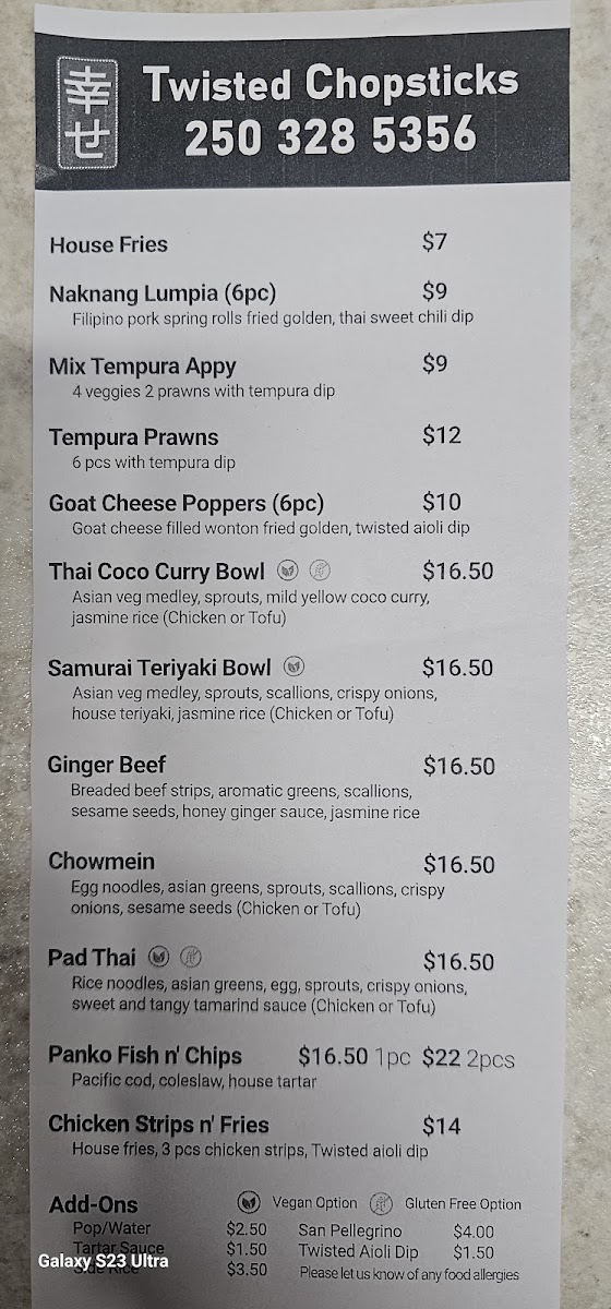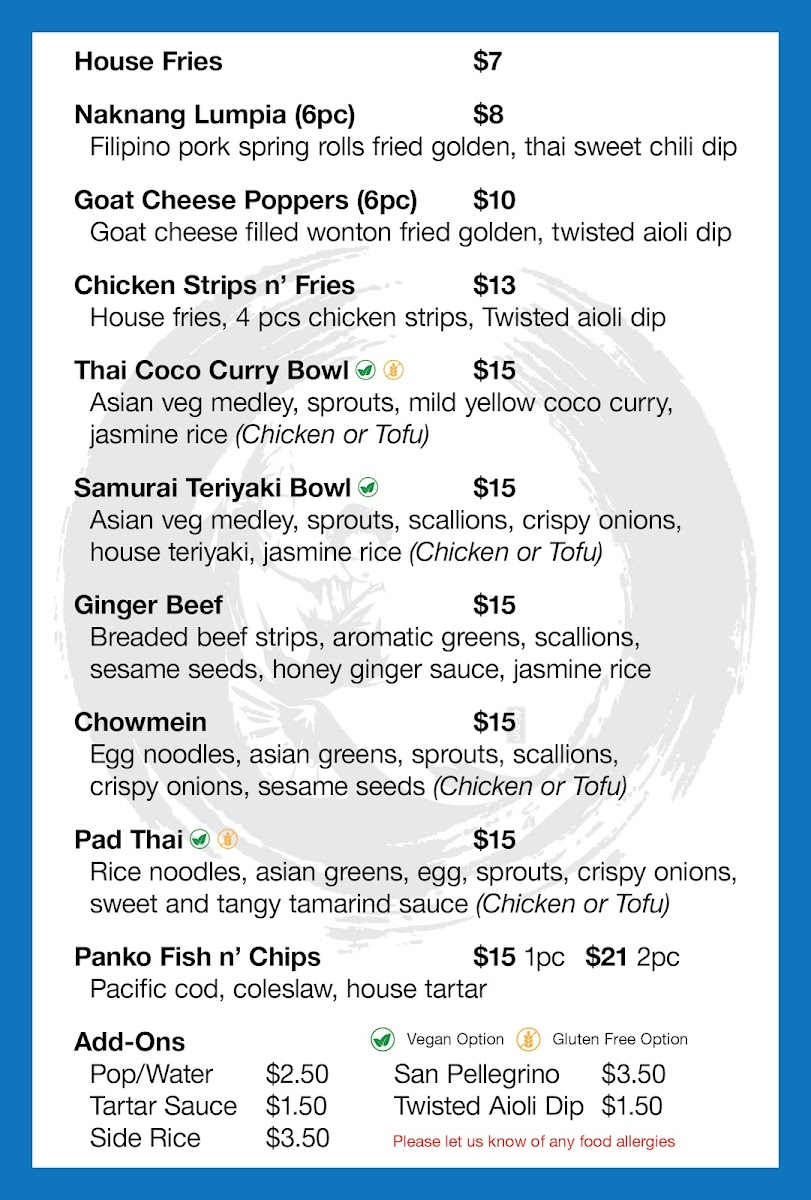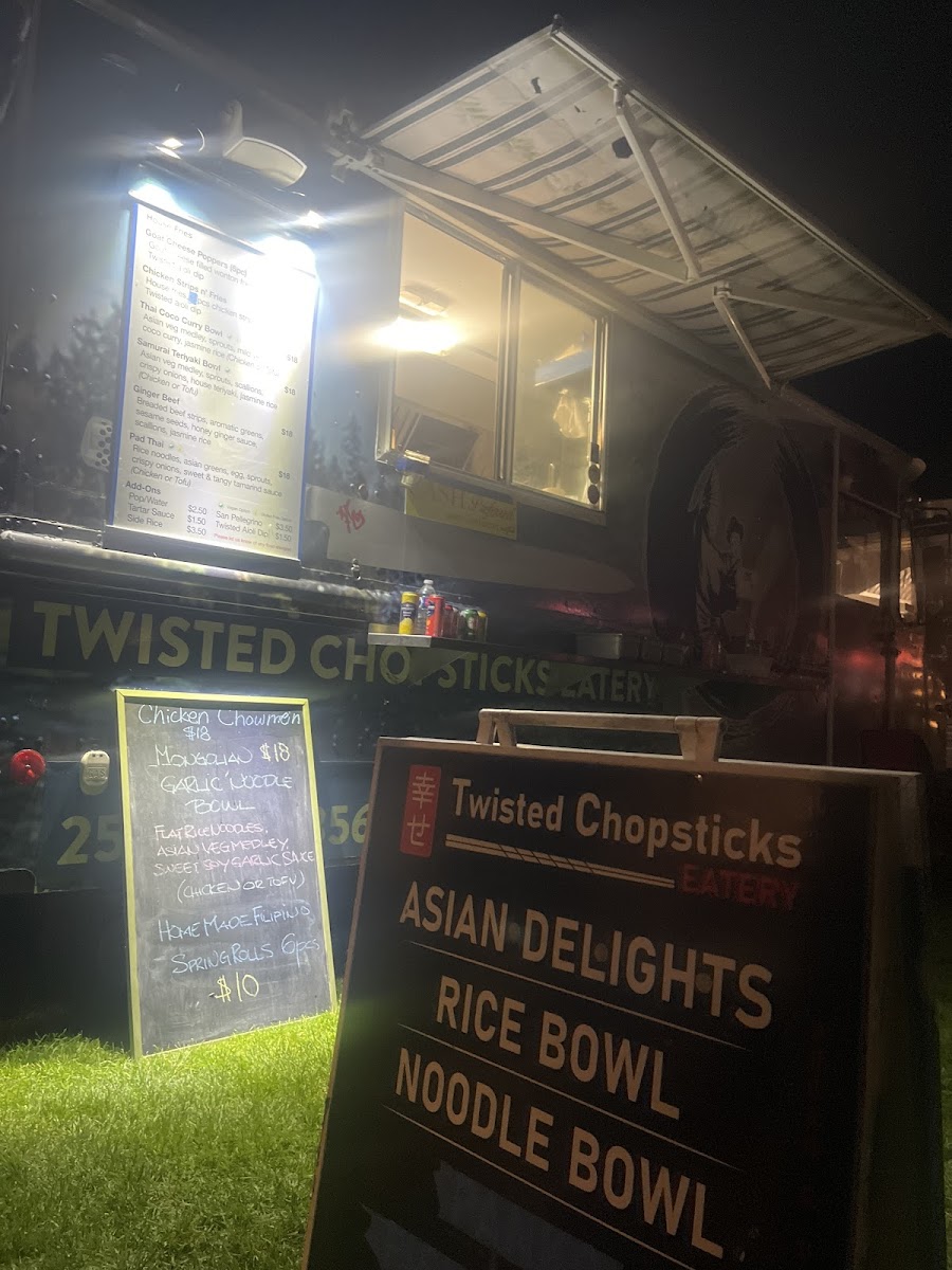 From a reviewer’s perspective, the menu at Twisted Chopsticks Eatery offers a satisfying mix of comfort food and Asian-inspired flavors, with a clear focus on approachable variety. The appetizer and handheld section features crowd-pleasers like House Fries, Naknang Lumpia 6pcs., and Goat Cheese Poppers 6pcs., setting a strong start. Their tempura options-Mix Tempura Appy and Tempura Prawns-add a crispy, well-executed touch. The bowls are a highlight, with flavorful choices such as Thai Coconut Curry Bowl, Samurai Teriyaki Bowl, Ginger Beef Chow Mein, and Pad Thai, each delivering hearty portions and bold taste. For classic comfort, the Panko Fish n' Chips (2pcs) and Chicken Strips n' Fries provide familiar favorites done right. Drinks remain simple with Water, Pop, and San Pellegrino, while extras like Side Rice, Tartar Sauce, and Twisted Aioli Dipping Sauce round out the experience. Overall, the menu feels well-balanced, offering something for both adventurous and traditional diners.